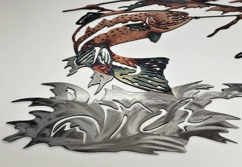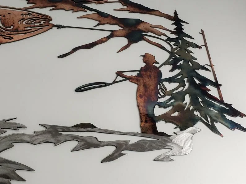 This unique piece is a perfect depiction of trout fishing in a mountain scene.